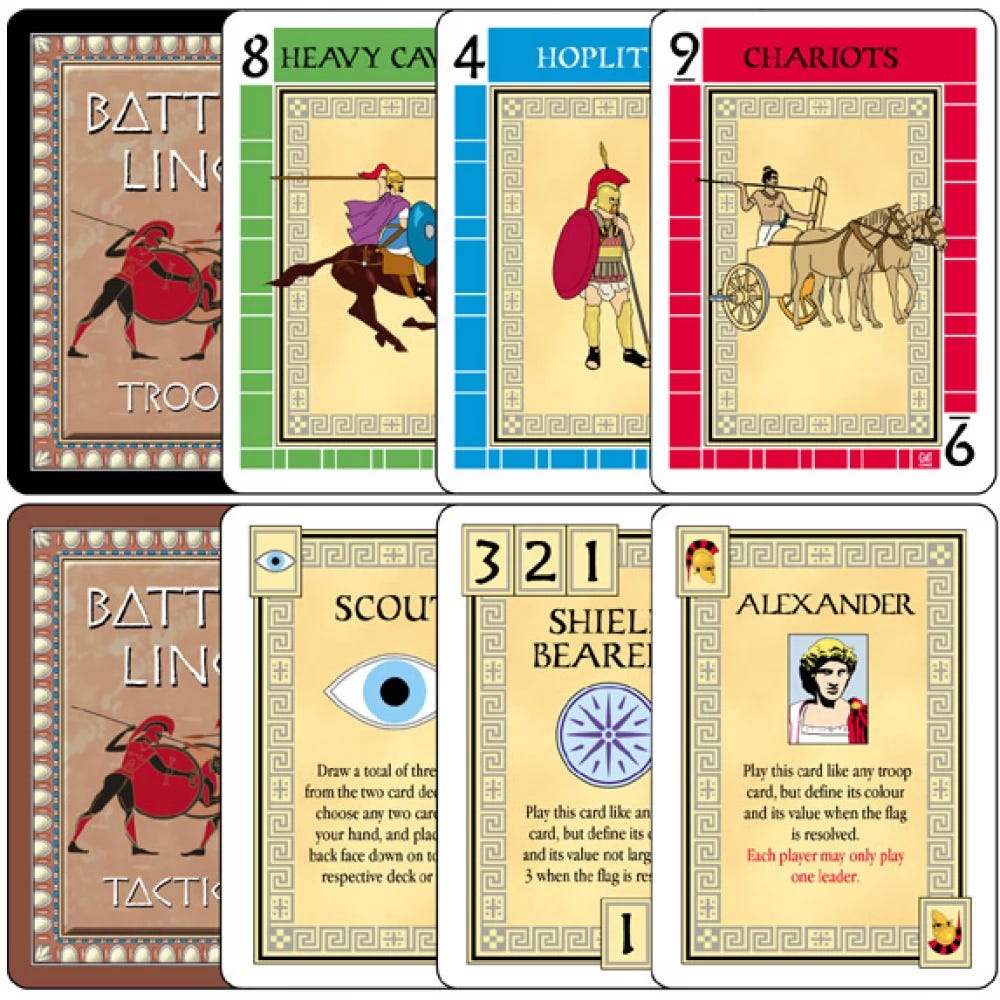 My favourite board game designer is Reiner Knizia. I’ve been meaning forever to search online for anything Reiner Knizia has written about board game design. Although, as it happens, my favourites of his “board games” do not involve boards. These non-board “board games” are Battle Line (a two-person card game, in which you both play nine hands of face-up poker at once, benefitting from Ancient-Greek-themed jokers and competing for red wooden pawn-shaped “flags”), and Kariba (the best of the recent trend for animal-themed small-box games). In The Conquest of Happiness, Bertrand Russell says something about using chess as a method for coping with grief. When my dad died, ten years ago, I spent the following days playing Battle Line.